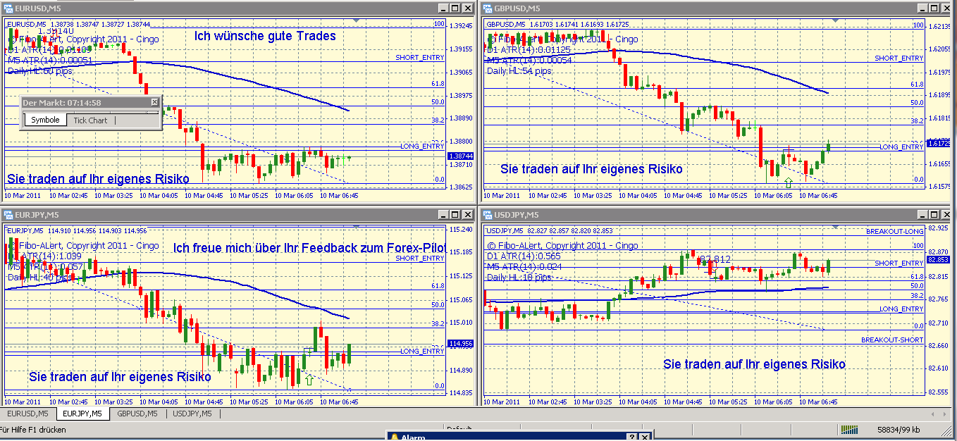 Da ich ein risikoscheuer Trader Typ bin, stelle ich alle meine Trades mit den Einstiegssignalen des Forex-Piloten bei EURUSD und GBPUSD auf 10 Pips Gewinn und 20 Pips SL, so nehme ich natürlich nicht die großen Gewinne mit, aber die 10 Pips pro Trade ergeben am Tag auch so ca. zwischen 10 -140 Pips, da Dein Forex Pilot am Tag reichlich Einstiegspunkte findet. Gut, hier und da gibt es auch 1-2 Fehlsignale am Tag, aber die kann ich dann wieder bis zum Abend locker reinholen.